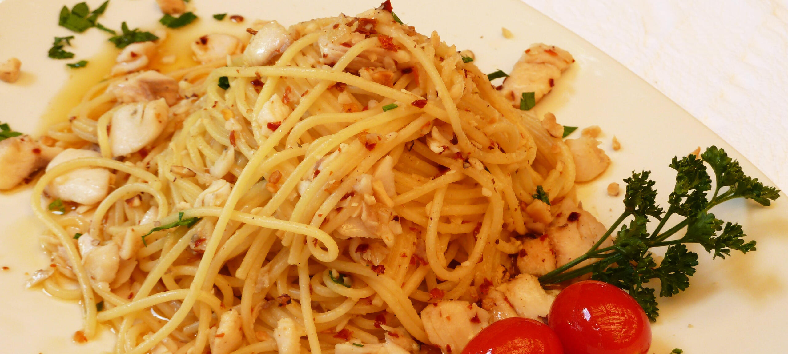 Pileći file, Njeguška pršuta, Kačkavalj ; Prilog - Taljatele u paradajz sosuPILETINA SA BADEMOM U SOSU OD MIROĐIJE (500g)