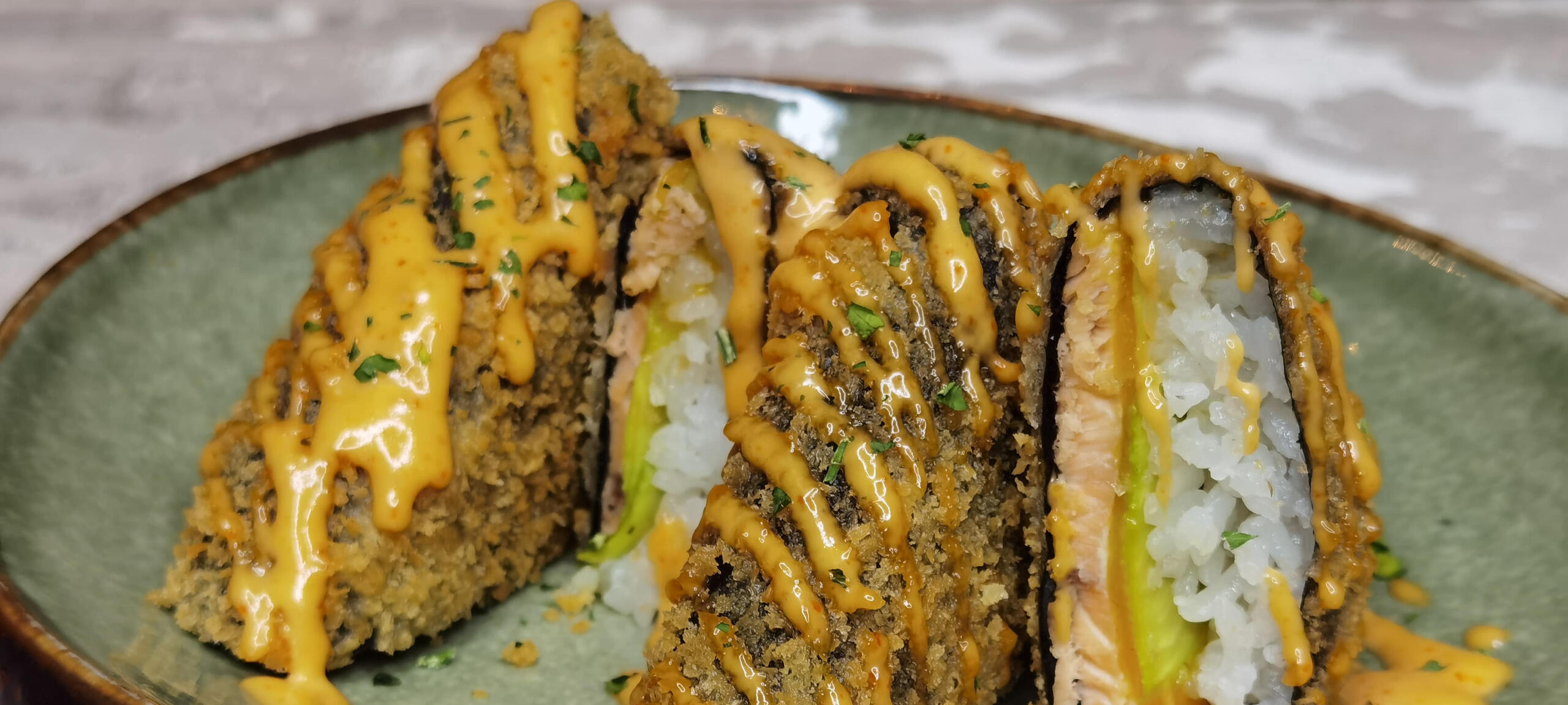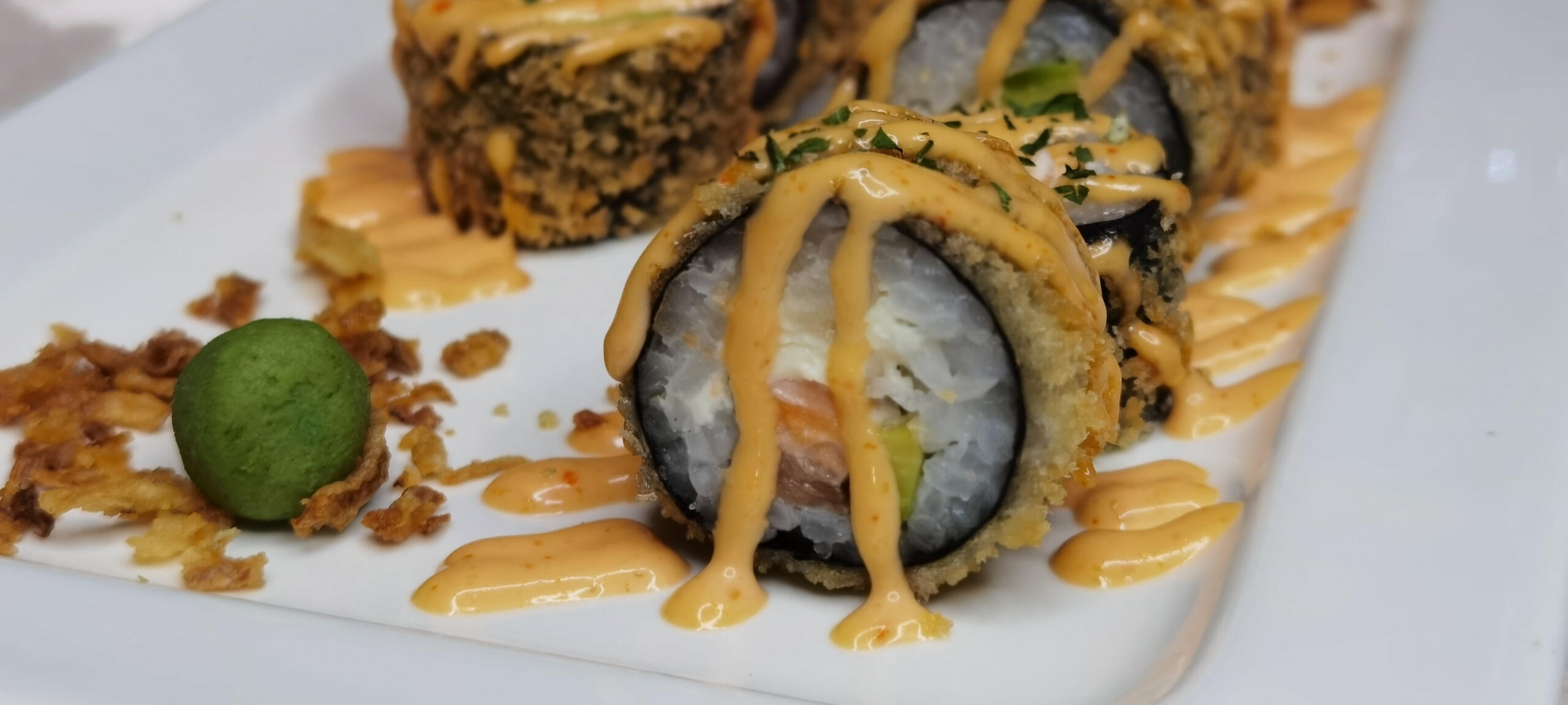 LOSOS, NORI ALGA, PIRINAČ, FILADELFIA KREM SIR, TEMPURA, PANKO PREZLE, JAP, MAJONEZ