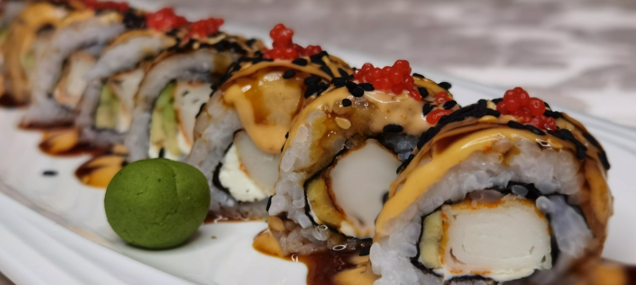 SURIMI, NORI ALGA, PIRINAČ, AVOKADO, FILADELFIA KREM SIR, JAP, MAJONEZ, UNAGI SOS